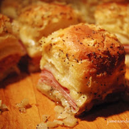 Lightly grease the bottom of a 9″ x 12″ baking pan. Place the bottom half of the rolls in the prepared pan and spread with half of the onion mixture.
