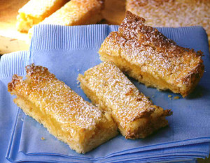 Use sharp knife to cut into desired size. Transfer to waxed paper or rack w/ paper towels underneath. Sprinkle with powdered sugar.