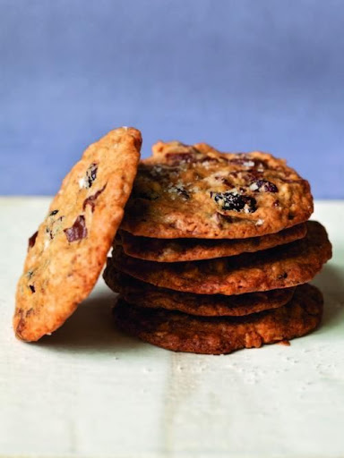 Meanwhile, sift the flour, baking soda, and salt into a medium bowl. Mix in the oats. With the mixer on low, slowly add the flour mixture to the butter-sugar mixture. Don’t overbeat it! With a rubber spatula, stir in the chocolate and cranberries until the dough is well mixed. With a 1¾-inch ice cream scoop (or two spoons), scoop round balls of dough onto the prepared sheet pans. Sprinkle lightly with fleur de sel. Bake for 10 to 12 minutes, until nicely browned. Serve warm or at room temperature.