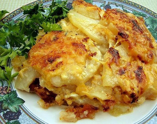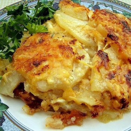 Place half of potatoes in a greased 3 quart baking dish. Pour half of sauce over potatoes. Repeat layers. Bake, uncovered, at 350°F for 60 to 70 minutes or until potatoes are tender and top is lightly browned. Serve immediately.