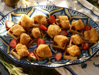 Arrange the waffle bites on a platter. Drizzle the waffles with a little syrup and top each bite with a chicken chunk. Serve with strawberries to garnish on the plate.