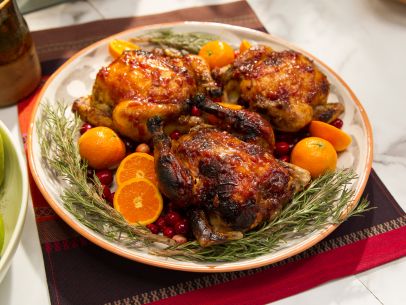 Place the glazed birds in an enameled cast-iron Dutch oven. Roast for 20 minutes, and then reglaze the birds. Check after 15 more minutes; if the sugars in the glaze are turning too brown, lightly tent the Dutch oven with foil to protect the skins. Baste again after 45 more minutes, then check with an instant-read thermometer after another 5 minutes; the thighs must register at 165 degrees F, the breasts at 170. Let rest for 10 minutes and serve.