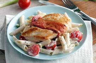 WRAP 1 bacon slice around each chicken breast. Heat large nonstick skillet on medium-high heat. Add chicken; cover. Cook 5 to 7 min. on each side or until chicken is done (165ºF). Remove chicken from skillet; cover to keep warm. Discard drippings in skillet.