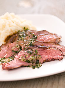 6. With long side facing you, slice lamb with grain into 3 equal pieces. Turn each piece and slice across grain into 1/4-inch-thick slices. Serve with sauce. (Briefly warm sauce in microwave if it has cooled and thickened.)