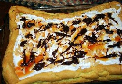 Drizzle with syrups and top with almonds. Cut into squares and serve. Keep leftovers in fridge. (Doesn't keep well)