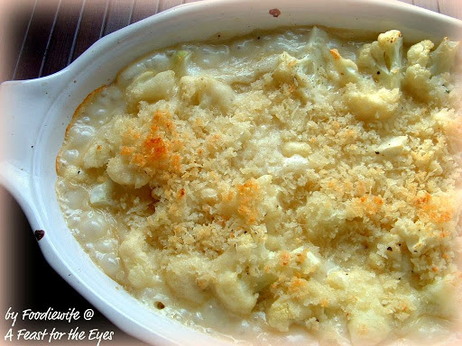 My family loved this dish, which had a nice light garlic-infused sauce and a crunchy panko crumb topping. The low-fat cheese that I recommend might take a little searching to find (Whole Foods is where I found it). It's a reduced fat cheese that tastes great! I reduced the butter with healthy Omega-3 olive oil and added herbs and aromatics, which yielded a creamy, flavorful sauce with perfectly cooked cauliflower that was slightly crunchy to the bite-- and not mushy. Nobody will know that this isn't a rich a decadent side dish!