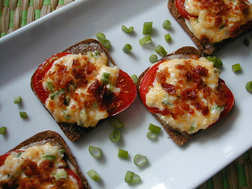 Spread untoasted sides of bread with remaining 1/3 cup mayonnaise. Top with tomato slices, and then cheese mixture. Sprinkle with bacon.