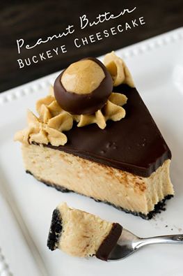For the peanut butter frosting: In a bowl, blend together peanut butter, powdered sugar, butter, and milk 3-4 minutes or until light and fluffy. Use an icing bag and tip 1M to pipe starts around the edges of the cheesecake. Place buckeye on each slice of cheesecake.