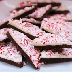 Melt the white chocolate in the top of a double boiler over just-barely simmering water, stirring frequently and scraping down the sides with a rubber spatula to avoid scorching. Stir in the oil-based peppermint flavoring. Pour the white chocolate over the milk chocolate, then spread the remaining 1/3 peppermint candy on top.