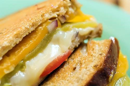 Open your can of whole green chilies (or if you have roasted your own fresh chilies, those are fabulous as well!) and lay one or two slices on top of the provolone. Now very carefully put the two halves of this glorious sandwich together.