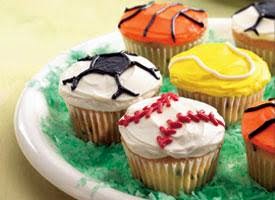 Baseballs: Frost cupcakes with vanilla frosting. With black, red or blue icing, pipe 2 arches on opposite sides of cupcakes, curving lines slightly toward center. Pipe small lines from each arch to resemble stitches on a baseball.