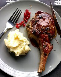 4.Preheat the oven to 325°. In a large skillet, heat the remaining 2 tablespoons of olive oil until shimmering. Remove the veal chops from the marinade; discard the thyme and scrape off the garlic. Season the chops with salt and pepper and add to the skillet. Cook over high heat until richly browned, about 3 minutes per side. Transfer the skillet to the oven and roast the chops for about 10 minutes, turning once halfway through; the veal should be just pink in the center. Transfer the chops to plates and spoon the sauce on top. Serve with Potato Puree.