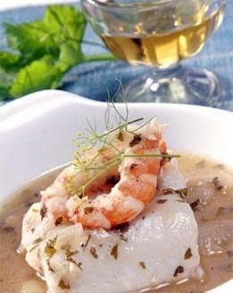 3.- Añadir a la olla el pescado cortado en lomos sin espinas y los camarones pelados. Cocer durante 10 minutos retirar del fuego y dejar reposar unos minutos. Servir el pescado con la salsa y los camarones espolvoreados con el perejil picado.