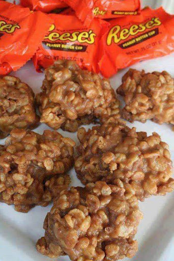 Melt 4 Reeses peanut butter cups and peanut butter in a pan with 3 tablespoons of butter. Fold in 3 cups rice krispies. Drop and cool on wax paper sheet or press into a buttered baking dish and when cool cut into squares.