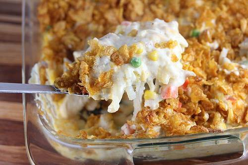 In a small bowl mix together melted butter and crushed corn flakes. Sprinkle the corn flakes onto top of the casserole. Place into the oven and bake for 1 hour or until the top is golden brown.