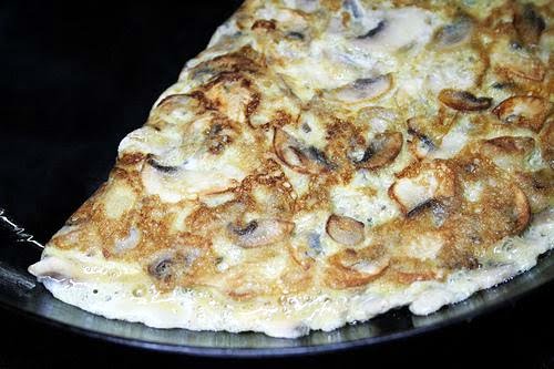 Pelar las patatas y cortarlas en forma de dado. Lavar muy bien los champiñones y dorarlos junto a las patatas en una sartén. Una vez dorado, añadimos las cebollas cortadas y el pimiento morrón. Echar un poco de sal y dejar durante 15 minutos.