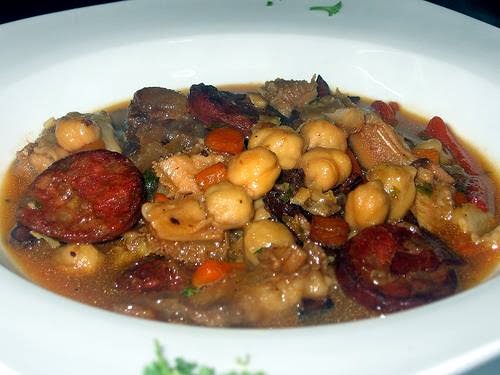 2.- Luego agrega las manitas de puerco, el chorizo en rodajas y las tiras de menudo. Incorpora el vino blanco y deja reducir 3-4 minutos. Luego agrega el caldo de res (caliente), el pimentón, el laurel, sal y pimienta.