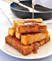 2. Beat the eggs,milk,cinnamon and salt. Quickly dip bread into egg mixture, shake off and fry in butter on all sides. While still hot roll in cinnamon sugar mixture.