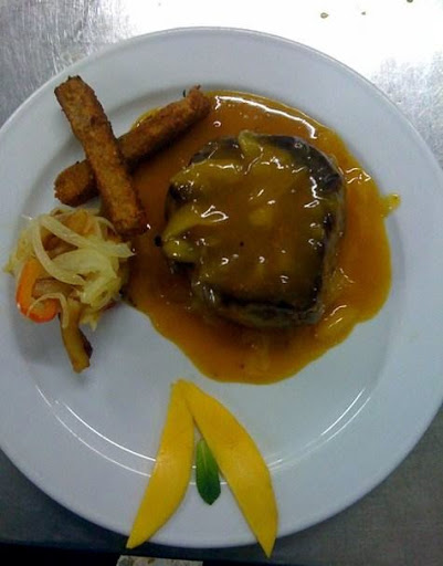 Aparte en un sartén con mantequilla dorar el solomillo ( el punto a su gusto) flamear con brandy y luego agregar la salsa que hemos preparado antes hasta realizar una reducción de la misma , colocamos también las lonchas de mango que habíamos retirado .