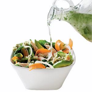 1. Arrange 2 1/2 cups lettuce on each of 4 plates. Top lettuce evenly with chicken, onion, carrot, avocado, and blue cheese. Drizzle each serving with 2 tablespoons Easy Herb Vinaigrette; serve immediately.