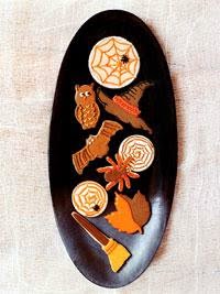 Decorate: Add food coloring to thin Royal Icing for base coat as desired. Use a thin spatula to spread icing to edges of cookies. Add food coloring to thick Royal Icing for piping as desired. Place in pastry bags with writing tips. Using the cookies pictured here and on our cover as a guide, pipe edging and designs on cookies. Sprinkle with cocoa powder, chocolate jimmies or assorted colored sugars as desired. To make a spiderweb: Paint cookies with white icing. Pipe contrasting spiral on top. Draw a knife through spiral, starting at center.