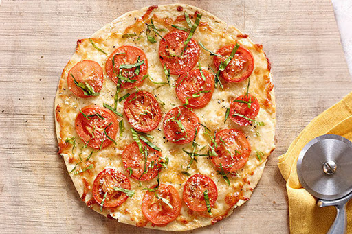 Place tortilla on baking sheet; brush with oil. Top with all remaining ingredients except basil.