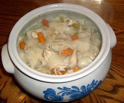 Drop in the dough squares; when doing this carefully place squares in various places in the stock pot. Allow the dough to sink before putting another square in that spot. Boil 8-10 minutes. If not thick enough add additional flour.