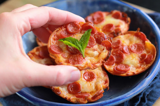 Bake in preheated oven for 10-12 minutes, or until cheese is bubbly. Remove and cool before using a fork to transfer mini pizzas from muffin tin to a serving plate.