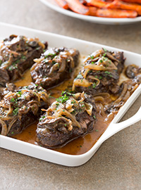 Baked steak, also called smothered steak, is a mostly hands-off dinner that makes the best of inexpensive steaks. Since these steaks (think blade, chuck, or round steaks) have more connective tissue than tender (and expensive) cuts like filets, they respond best to braising. We chose blade steaks for their great flavor and found that this slow-cooking method melted the thin line of gristle that bisects the meat. Browning the steaks with cornstarch before adding the other ingredients introduces flavor to the steaks, creates fond in the pan, and helps thicken the sauce. A base of raw onions and mushrooms forms a bed for the steaks; as they oven-braise in a covered skillet for 2 hours, they steam and release flavorful liquid that becomes the sauce (no broth is necessary). A tablespoon each of tomato paste and soy sauce gives the sauce depth and intensity, and rosemary and parsley add a note of freshness.