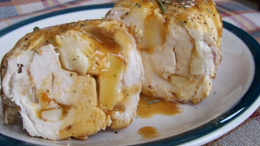 Flatten chicken breasts between sheets of waxed paper to 1/4 inch thickness. Divide apple mixture between chicken breasts, and roll up each breast. Secure with toothpicks.