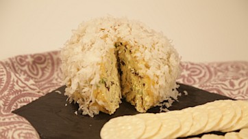 Transfer cheese mixture to the plastic. Use the plastic wrap to form into a ball. Transfer cheese ball to a platter. Pour chutney over the cheese ball to cover. Sprinkle coconut flakes on the cheese ball to cover. Serve with rice crackers.