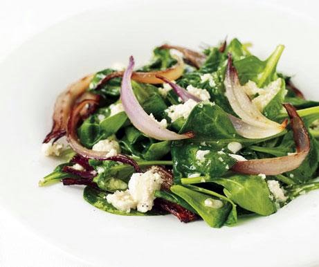 Place spinach in large bowl. Heat 2 tablespoons oil in heavy large skillet over high heat. Add onion; sauté until brown and softened, about 7 minutes. Transfer to bowl with spinach; remove skillet from heat. Add remaining 3 tablespoons oil and cheese to skillet. Stir to melt cheese slightly, about 1 minute. Stir in vinegar. Season to taste with salt and pepper. Pour over spinach; toss to coat and wilt slightly.