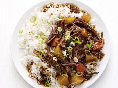 Remove the vegetables to a bowl using a slotted spoon. Shred the beef with two forks; stir in the sauce to coat. Serve the beef with the vegetables and rice; top with scallions.