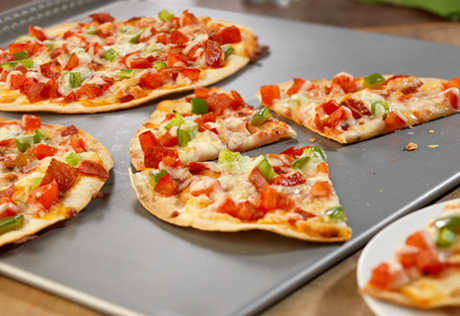These individual tortilla pizzas, topped with pepperoni, picante sauce and mozzarella cheese bake to crispness in just minutes.