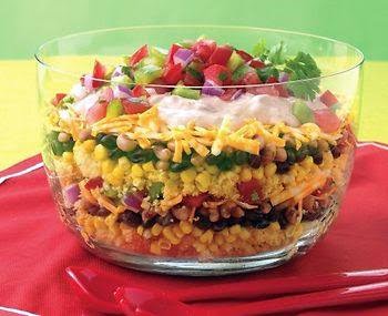 Layer a 4-quart bowl with half of lettuce, half of crumbled cornbread, black beans, corn/red peppers, 1/2 of Cheddar cheese, and red onions, and avocado.