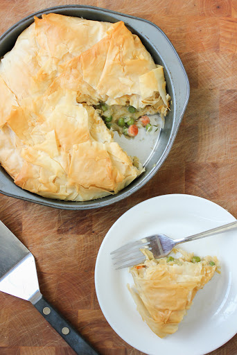 This vegan chicken pot pie is comfort food to the max and despite the scary phyllo crust is easy to put together. The more I work with phyllo, the more I love it and realize how forgiving it is despite how much it folds and cracks when I’m assembling it. Oh government, you could learn a thing or two from phyllo.