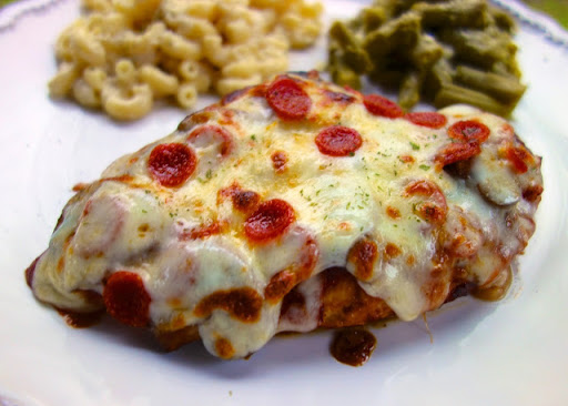 - Preheat broiler. Place chicken on rimmed baking sheet. Spread 2 Tablespoons of pizza sauce on top of each chicken breast. Top with pizza toppings. Sprinkle mozzarella over toppings. Place chicken under broiler until cheese is melted and bubbly.