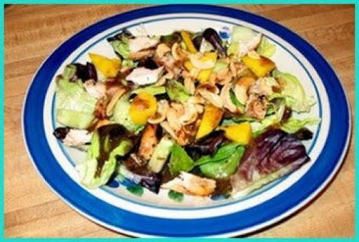 4. Layer chopped lettuce, beans, bell pepper, chicken, pineapple, bacon and green onions over each lettuce lear. Drizzle dressing over salad.