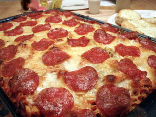 Cover top of casserole with remaining pepperoni like you top a pizza.