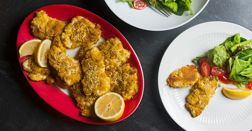 5. Working one at a time, place the oiled chicken piece into the panko mix, coating both sides well, and place onto the prepared sheet pan. Drizzle with the remaining olive oil and top with the remaining cheese.