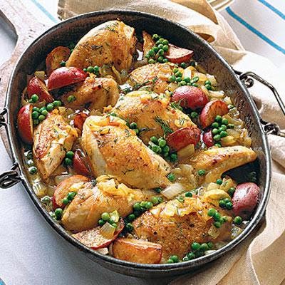 2.Finish the casserole: In the same skillet, add the reserved oil and the potatoes; cook over high heat on one side until browned -- about 10 minutes. Add the onions and cook for 2 minutes. Add the sparkling wine and let boil for 1 minute. Return the chicken pieces to the skillet; transfer to oven and roast for 40 minutes. Add the peas to the skillet and cook for an additional 5 minutes. Dot the chicken pieces with equal amounts of the butter and let it melt over the chicken. Sprinkle the dill over the casserole and serve immediately.