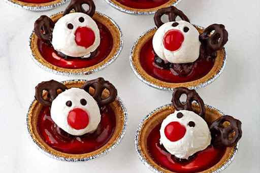 Decorate tops of tarts with pretzels and remaining ingredients to resemble reindeer as shown in photo.