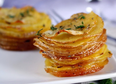 Lay another slice of potato into each tin, and brush with oil. At every third layer, sprinkle with a little salt and pepper. Repeat stacking, brushing with oil, and seasoning until you have used up the potato slices. At the top of each stack, season with salt and pepper, and sprinkle with fresh thyme leaves.