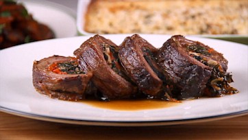 Remove the brisket from the Dutch oven and place on a clean work surface. Arrange a layer of the cooled spinach mixture over the entire brisket, leaving a 1/2-inch border on all sides. Tightly roll the meat like a jellyroll. Secure with kitchen twine every few inches.