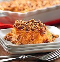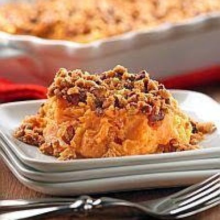 # In a medium bowl, combine 1/4 cup butter, flour, brown sugar, and chopped pecans. Mix with a pastry blender or your fingers to the consistency of course meal. Sprinkle over the sweet potato mixture.