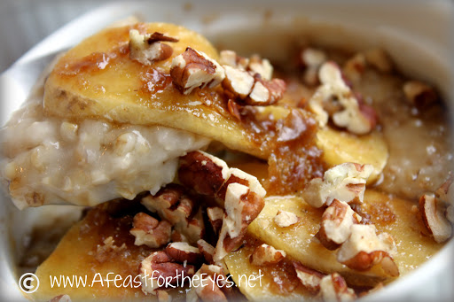 Heat broiler, with rack 4 inches from heat. Top oatmeal with bananas and brown sugar and broil until bananas are caramelized, 3 to 4 minutes. Sprinkle with pecans to serve. Broil the oatmeal until it's bubbly and caramelized (watch closely, this may take 1 to 1 1/2 minutes). NOTE: I have a brûlée torch, but didn't want to use the propane, since the broiler worked just tine.