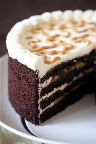 3. Let cake cool completely, then top with whipped topping. Decorate the top of the cake with some more chocolate toffee bar chunks and swirls of caramel topping. Refrigerate and serve right from the pan!