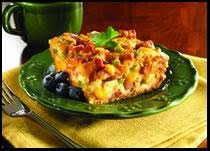 3. In a large bowl beat together eggs and milk. Mix in cheese, bacon, onion and green pepper. Stir in the thawed hash browns. Pour mixture into prepared casserole.