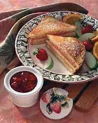 3. Dip each sandwich quarter in the batter so that all sides are coated. Deep fry in the hot oil until golden brown on all sides. Remove toothpicks and arrange on a serving tray. Dust with confectioners' sugar just before serving.