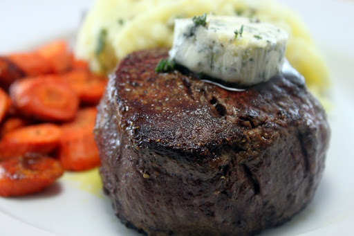 DISCLAIMER: The reason this dish is so amazing is due mostly in part to having the very best, most fresh ingredients possible. That means high grade salt, it means pepper ground right in front of you by a pepper mill. It means fresh herbs and it means REAL BUTTER. The good news is that these are all things you should already have in your house. Take 1/2 stick of butter, softened, and mix well with the peeled, chopped garlic, the chopped herbs, and the lemon zest. Form into a log and refrigerate. Generously season the filet's with salt and pepper, approximately 1 teaspoon of seasoning per side. Heat the remainder of the butter (1/2 stick) and the olive oil in a cast iron skillet to a screaming hot temperature. Preheat your oven to 400 degrees. Sear the filets in a screaming hot pan for about 2-3 minutes per side, or until a nice brown crust has formed. While the steak is searing, continue to spoon the residual butter in the pan on top of the meat while it's cooking. Once both sides are seared, place in the center of the oven for about 6-8 minutes, depending upon how thick your steak is. In the last minute of cooking, take the log of compound butter and slice a nice thick piece to place on top. Your steak will be ready when it is approximately 135 degrees in the center, or when you push lightly on the top center of the steak and it gently and slowly bounces back. (Note, this is medium rare kids. Some people don't like to eat cows while they are mooing, so clearly you can cook longer if your afraid of the pink.)